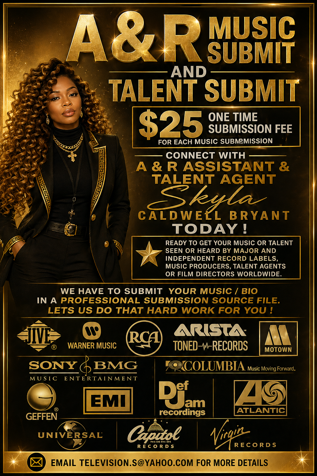 MUSIC & TALENT SUBMIT A Christian Entertainment Platform GOT TALENT? GOT MUSIC? ★ CALLING ALL CHRISTIAN MUSIC ARTIST & ACTORS.★ READY TO TAKE YOUR UNIQUE TALENT TO THAT NEXT LEVEL. MUSIC & TALENT SUBMIT Now connected with many , connected with major and independent RECORD LABELS, MUSIC PRODUCERS, FILM DIRECTORS & TALENT AGENTS worldwide. A&RARTIST & REPERTOIRE CASTING SEARCH Record LabelsMusic ProducersFilm DirectorsTalent AgentsWorldwide Opportunities OUR SERVICES: ✓ We will submit your music or talent for review.✓ We will send listings of open casting calls by email.✓ All will receive VIP discount pass to any gospel events, TV shows, awards ceremonies and much much more. $25 SUBMISSION FEEUp to 3 months of promotion $75 SUBMISSION FEEUp to 1 year of promotion Text: SUBMIT @ television.s@yahoo.comor 561-929-5162 FAITH. TALENT. PURPOSE.Use It For His Glory! Gospel EventsTV ShowsAwards Ceremonies YOUR TALENT. HIS GLORY. YOUR FUTURE.